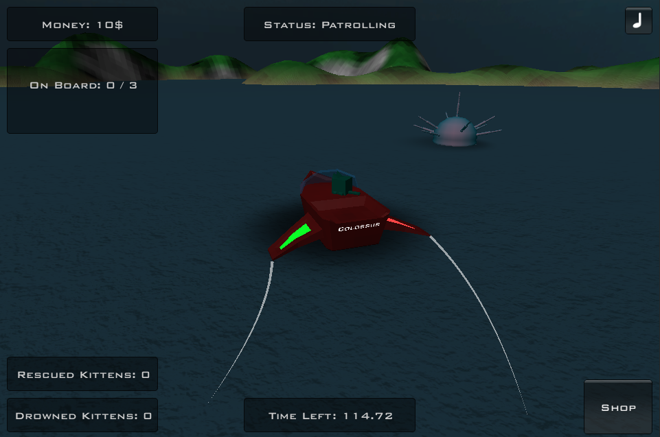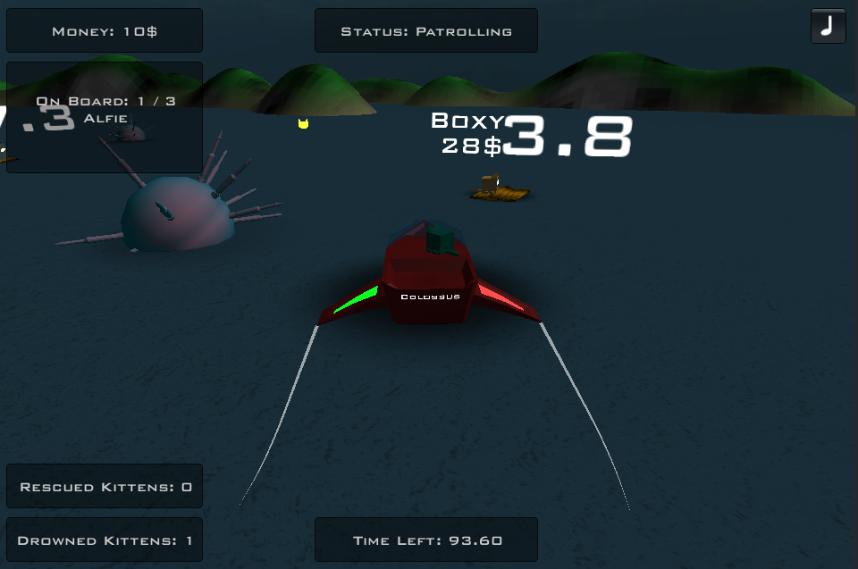 You play as Boxy the Boxcat, saving drowning, procedurally generated kittens. You have to avoid deadly mines, can collect money, and upgrade your ship with better values, a radar and torpedoes.
