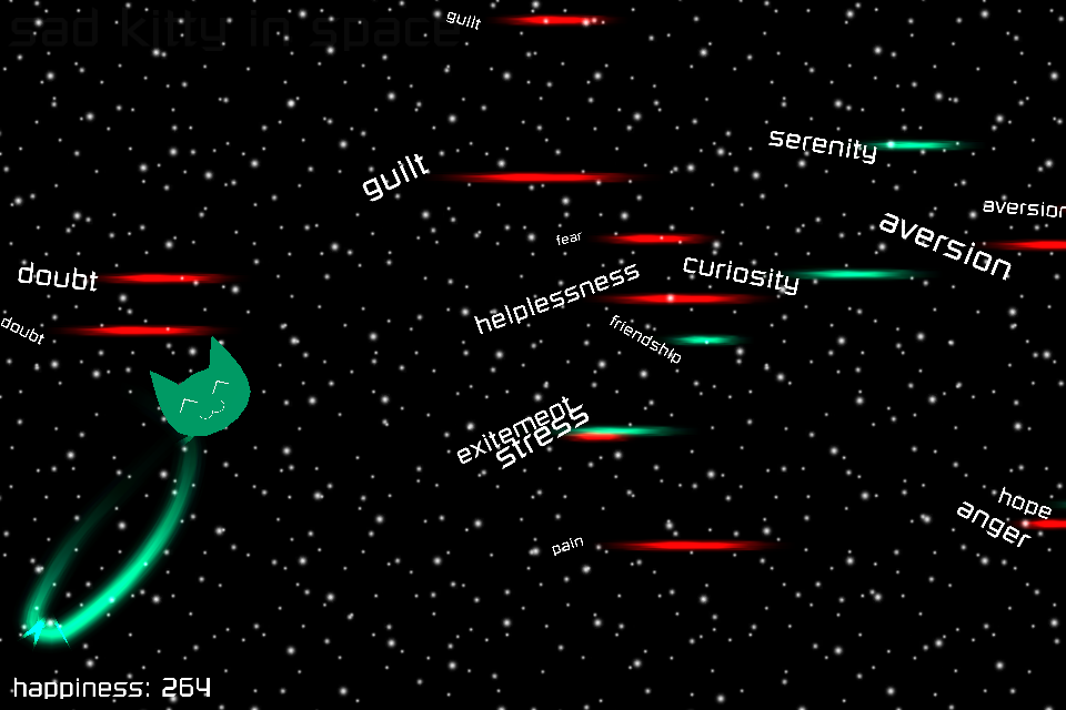 You’re a sad kitty in space, trying to eat good emotions and to avoid bad emotions.