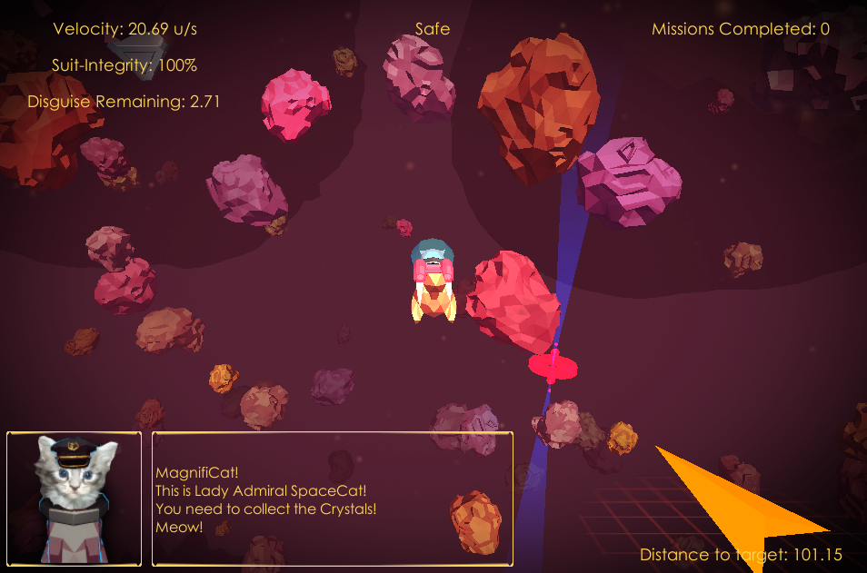 You are Magnificat, exploring a colorful asteroid-field and completing missions given by your commander, Lady Admiral SpaceCat. To avoid deadly sentries you can disguise yourself as an asteroid for up to 7 seconds, during which you are invisible.
