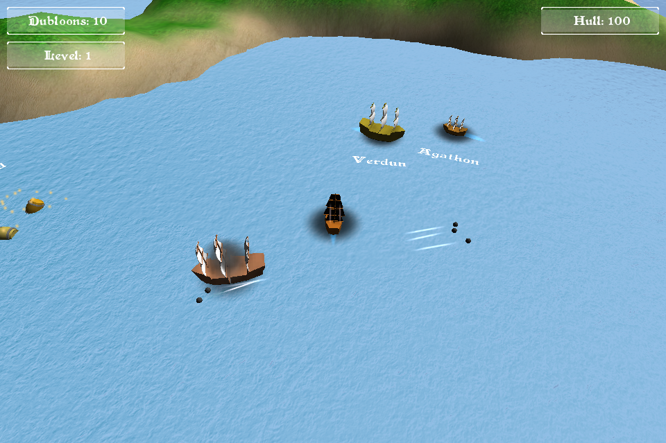 You control a Pirate-Ship during the Age of Sail. You can attack other ships, which are procedurally generated and each have an unique name. Ships drop dubloons, which you can collect. After a certain amount collected you level up and can adapt your stats.